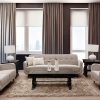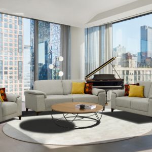 Sala esquinera tapizada en tela azul con detalle en madera y pata de aluminio, medidas 3.00m x 1.70